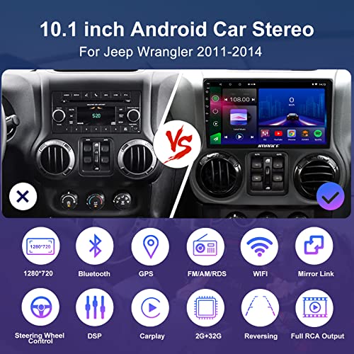 2+32GB Android Car Stereo for Jeep Wrangler 2011-2014 with Wireless Carplay Android Auto, 10.1 inch GPS Navigation with Backup Camera Bluetooth AM FM RDS Radio WiFi GPS SWC